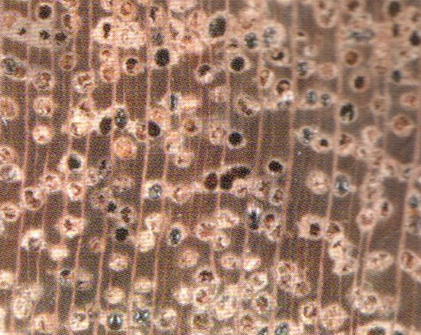 心邊材區(qū)刖路明顯、心材灰紅褐色至紅褐色。久則轉(zhuǎn)為巧克力色。邊材淺灰褐色、寬5~10cm,生長輪不明顯。